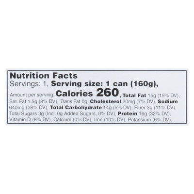 PRODUCT DETAILS: 100% Pole & line caught tuna. 16 g protein per serving. Certfied Organic by CRAEGA. Non-GMO Project verified. nongmoproject.org. Ready to eat. Our Wildly Good Promise: Wildly good for the planet. Wildly good for you. Wildly good taste. wildplanetfoods.com/faqs. nongmoproject.org. 100% recyclable packaging. Non-BPA lining explained at wildplanetfoods.corn/faqs. Globally sourced fish - pole & line vessels only. Processed in Spain.