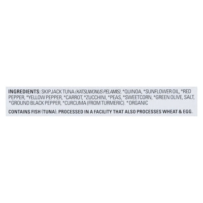 INGREDIENTS: Skip Jack Tuna (Katsuwonus Pelamis), Quinoa (Organic), Sunflower Oil (Organic), Red Pepper (Organic), Yellow Pepper (Organic), Carrot (Organic), Zucchini (Organic), Peas (Organic), Sweetcorn (Organic), Green Olive (Organic), Salt, Ground Black Pepper (Organic), Curcuma (Organic) (from Turmeric).