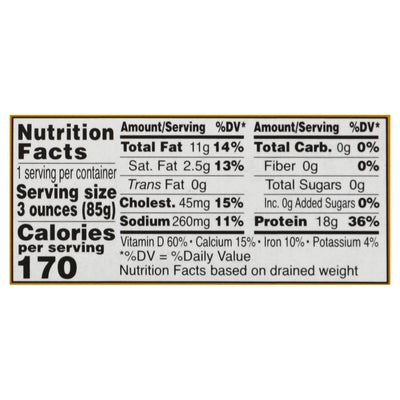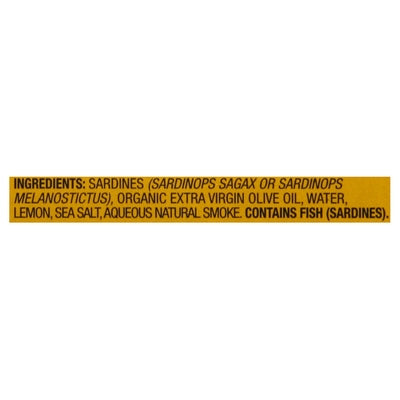 INGREDIENTS: Sardines (Sardinops Sagax or Sardinops Melanostictus), Organic Extra Virgin Olive Oil, Water, Lemon, Sea Salt, Aqueous Natural Smoke.