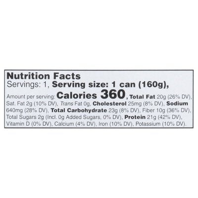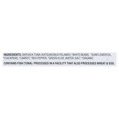 INGREDIENTS: Skipjack Tuna (Katsuwonus Pelamis), White Beans (Organic), Sunflower Oil (Organic), Chickpeas (Organic), Carrot (Organic), Red Pepper (Organic), Green Olive (Organic), Water, Salt.