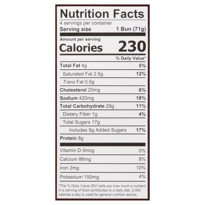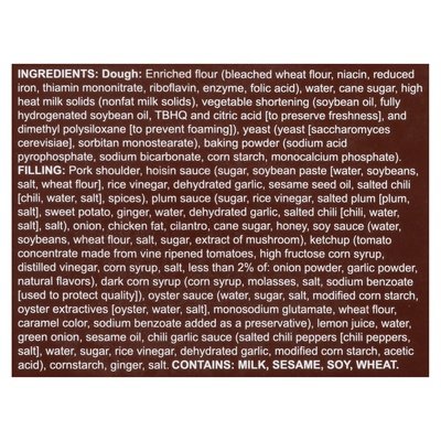 INGREDIENTS: Dough: Enriched Flour (Bleached Wheat Flour, Niacin, Reduced Iron, Thiamin Mononitrate, Riboflavin, Enzyme, Folic Acid), Water, Cane Sugar, High Heat Milk Solids (Nonfat Milk Solids), Vegetable Shortening (Soybean Oil, Fully Hydrogenated Soybean Oil, TBHQ and Citric Acid [to Preserve Freshness], and Dimethyl Polysiloxane [to Prevent Foaming]), Yeast (Yeast [Saccharomyces Cerevisiae], Sorbitan Monostearate), Baking Powder (Sodium Acid Pyrophosphate, Sodium Bicarbonate, Corn Starch, Monocalcium Phosphate), Filling: Pork Shoulder, Hoisin Sauce (Sugar, Soybean Paste [Water, Soybeans, Salt, Wheat Flour], Rice Vinegar, Dehydrated Garlic, Sesame Seed Oil, Salted Chili [Chili, Water, Salt], Spices), Plum Sauce (Sugar, Rice Vinegar, Salted Plum [Plum, Salt], Sweet Potato, Ginger, Water, Dehydrated Garlic, Salted Chili [Chili, Water, Salt], Salt), Onion, Chicken Fat, Cilantro, Cane Sugar, Honey, Soy Sauce (Water, Soybeans, Wheat Flour, Salt, Sugar, Extract of Mushroom), Ketchup (Tomato Concentrate Made from Vine Ripened Tomatoes, High Fructose Corn Syrup, Distilled Vinegar, Corn Syrup, Salt, Less than 2% of: Onion Powder, Garlic Powder, Natural Flavors), Dark Corn Syrup (Corn Syrup, Molasses, Salt, Sodium Benzoate [Used to Protect Quality]), Oyster Sauce (Water, Sugar, Salt, Modified Corn Starch, Oyster Extractives [Oyster, Water, Salt], Monosodium Glutamate, Wheat Flour, Caramel Color, Sodium Benzoate Added as a Preservative), Lemon Juice, Water, Green Onion, Sesame Oil, Chili Garlic Sauce (Salted Chili Peppers [Chili Peppers, Salt], Water, Sugar, Rice Vinegar, Dehydrated Garlic, Modified Corn Starch, Acetic Acid), Cornstarch, Ginger, Salt.