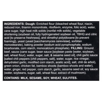 INGREDIENTS: Dough: Enriched Flour (Bleached Wheat Flour, Niacin, Reduced Iron, Thiamin Mononitrate, Riboflavin, Enzyme, Folic Acid), Water, Cane Sugar, High Heat Milk Solids (Nonfat Milk Solids), Vegetable Shortening (Soybean Oil, Fully Hydrogenated Soybean Oil, TBHQ and Citric Acid [to Preserve Freshness], and Dimethyl Polysiloxane [to Prevent Foaming]), Yeast (Yeast [Saccharomyces Cerevisiae], Sorbitan Monostearate), Baking Powder (Sodium Acid Pyrophosphate, Sodium Bicarbonate, Corn Starch, Monocalcium Phosphate). Filling: Ground Beef, Sauce (Cane Sugar, Bean Sauce [Soybean Paste {Water, Soybean, Salt, Wheat Flour}, Water, Sugar, Salt, & Sesame Seed Oil], Chili Garlic Sauce [Salted Chili Peppers {Chili Peppers, Salt}, Water, Sugar, Rice Vinegar, Dehydrated Garlic, Modified Corn Starch, Acetic Acid], Salt, Chili De Arbol), Green Onion, Chicken Fat, Bamboo Shoots (Bamboo Shoots and Water), Water, Ginger, Red Pepper, Corn Starch, Garlic, Sesame Seed Oil, Soy Sauce (Water, Soybeans, Sugar, Salt, Wheat Flour, Extract of Mushroom).