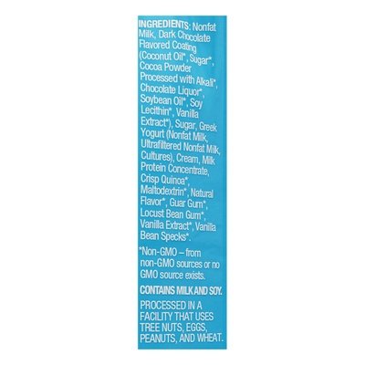 INGREDIENTS: Nonfat Milk, Dark Chocolate Flavored Coating (Coconut Oil (Non-GMO-from Non-GMO Sources or No GMO Source Exists), Sugar (Non-GMO-from Non-GMO Sources or No GMO Source Exists), Cocoa Powder Processed with Alkali (Non-GMO-from Non-GMO Sources or No GMO Source Exists), Chocolate Liquor (Non-GMO-from Non-GMO Sources or No GMO Source Exists), Soybean Oil (Non-GMO-from Non-GMO Sources or No GMO Source Exists), Soy Lecithin (Non-GMO-from Non-GMO Sources or No GMO Source Exists), Vanilla Extract (Non-GMO-from Non-GMO Sources or No GMO Source Exists)), Sugar, Greek Yogurt (Nonfat Milk, Ultrafiltered Nonfat Milk, Cultures), Cream, Milk Protein Concentrate, Crisp Quinoa (Non-GMO-from Non-GMO Sources or No GMO Source Exists), Maltodextrin (Non-GMO-from Non-GMO Sources or No GMO Source Exists), Natural Flavor (Non-GMO-from Non-GMO Sources or No GMO Source Exists), Guar Gum (Non-GMO-from Non-GMO Sources or No GMO Source Exists), Locust Bean Gum (Non-GMO-from Non-GMO Sources or No GMO Source Exists), Vanilla Extract (Non-GMO-from Non-GMO Sources or No GMO Source Exists), Vanilla Bean Specks (Non-GMO-from Non-GMO Sources or No GMO Source Exists).