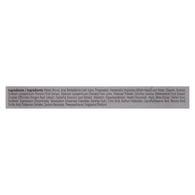 INGREDIENTS: Water (Aqua), Aloe Barbadensis Leaf Juice, Glycerin, Charcoal Powder, Solanum Lycopersicum (Tomato) Fruit/Leaf/Stem Extract, Lycium Barbarum (Goji) Fruit Extract, Vitis Vinifera (Grape) Seed Extract, Niacinamide, Kaolin, Citric Acid, Xanthan Gum, Sodium Benzoate, Potassium Sorbate, Fragrance (Parfum), Coumarin, Limonene, Butylphenyl Methylpropional, Linalool.