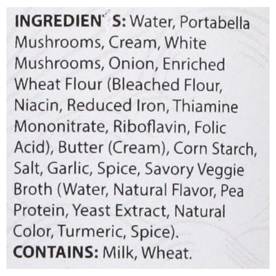 INGREDIENTS: Water, Portabella Mushrooms, Cream, White Mushrooms, Onion, Enriched Wheat Flour (Bleached Flour, Niacin, Reduced Iron, Thiamine Mononitrate, Riboflavin, Folic Acid), Butter (Cream), Corn Starch, Salt, Garlic, Spice, Savory Veggie Broth (Water, Natural Flavor, Pea Protein, Yeast Extract, Natural Color, Turmeric, Spice).