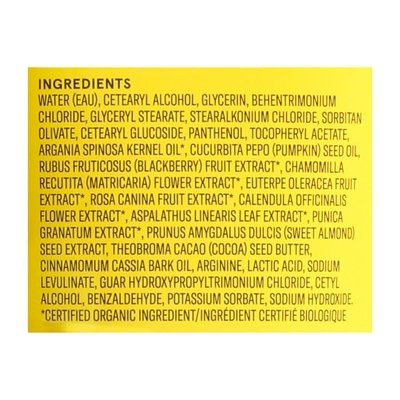 INGREDIENTS: Water (Eau), Cetearyl Alcohol, Glycerin, Behentrimonium Chloride, Glyceryl Stearate, Stearalkonium Chloride, Sorbitan Olivate, Cetearyl Glucoside, Panthenol, Tocopheryl Acetate, Argania Spinosa Kernel Oil (Certified Organic Ingredient), Cucurbita Pepo (Pumpkin) Seed Oil, Rubus Fructicosus (Blackberry) Fruit Extract (Certified Organic Ingredient), Chamomilla Recutita (Matricaria) Flower Extract (Certified Organic Ingredient), Euterpe Oleracea Fruit Extract (Certified Organic Ingredient), Rosa Canina Fruit Extract (Certified Organic Ingredient), Calendula Officinalis Flower Extract (Certified Organic Ingredient), Aspalathus Linearis Leaf Extract (Certified Organic Ingredient), Punica Granatum Extract (Certified Organic Ingredient), Prunus Amygdalus Dulcis (Sweet Almond) Seed Extract, Theobroma Cacao (Cocoa) Seed Butter, Cinnamomum Cassia Bark Oil, Arginine, Lactic Acid, Sodium Levulinate, Guar Hydroxypropyltrimonium Chloride, Cetyl Alcohol, Benzaldehyde, Potassium Sorbate, Sodium Hydroxide.