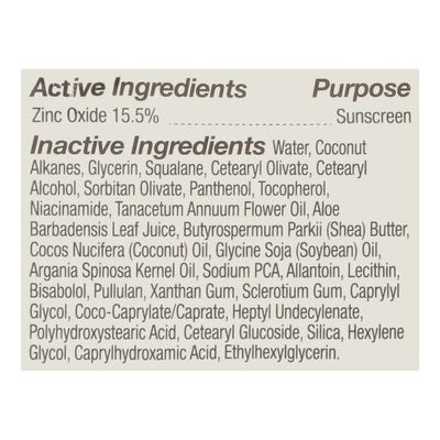 INGREDIENTS: Active Ingredients: Zinc Oxide (15.5 %), Sunscreen. Inactive Ingredients: Water, Coconut Alkanes, Glycerin, Squalane, Cetearyl Olivate, Cetearyl Alcohol, Sorbitan Olivate, Panthenol, Tocopherol, Niacinamide, Tanacetum Annuum Flower Oil, Aloe Barbadensis Leaf Juice, Butyrospermum Parkii (Shea) Butter, Cocos Nucifera (Coconut) Oil, Glycine Soja (Soybean) Oil, Argania Spinosa Kernel Oil, Sodium PCA, Allantoin, Lecithin, Bisabolol, Pullulan, Xanthan Gum, Sclerotium Gum, Caprylyl Glycol, Coco-Caprylate/Caprate, Heptyl Undecylenate, Polyhydroxystearic Acid, Cetearyl Glucoside, Silica, Hexylene Glycol, Caprylhydroxamic Acid, Ethylhexyglycerin.