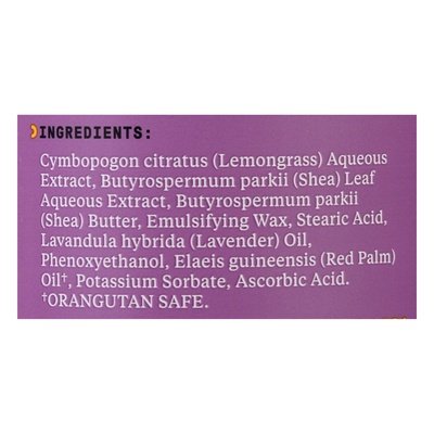 INGREDIENTS: Cymbopogon Citratus (Lemongrass) Aqueous Extract, Butyrospermum Parkii (Shea) Leaf Aqueous Extract, Butyrospermum Parkii (Shea) Butter, Emulsifying Wax, Stearic Acid, Lavandula Hybrida (Lavender) Oil, Phenoxyethanol, Elaeis Guineensis (Red Palm) Oil (Orangutan Safe), Potassium Sorbate, Ascorbic Acid.