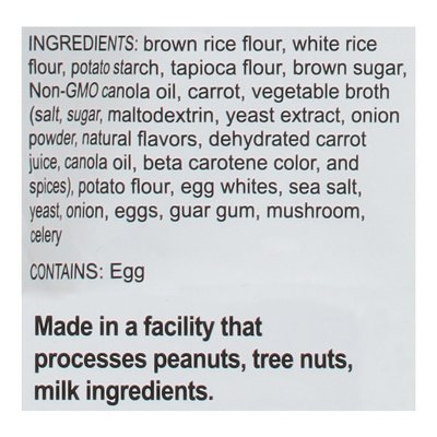 INGREDIENTS: Brown Rice Flour, White Rice Flour, Potato Starch, Tapioca Flour, Brown Sugar, Non-GMO Canola Oil, Carrot, Vegetable Broth (Salt, Sugar, Maltodextrin, Yeast Extract, Onion Powder, Natural Flavors, Dehydrated Carrot Juice, Canola Oil, Beta Carotene Color, and Spices), Potato Flour, Egg Whites, Sea Salt, Yeast, Onion, Eggs, Guar Gum, Mushroom, Celery.