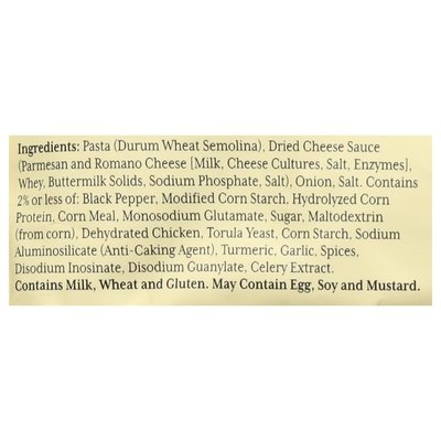 INGREDIENTS: Pasta (Durum Wheat Semolina), Dried Cheese Sauce (Parmesan and Romano Cheese [Milk, Cheese Cultures, Salt, Enzymes], Whey, Buttermilk Solids, Sodium Phosphate, Salt), Onion, Salt. Contains 2% or Less of: Black Pepper, Modified Corn Starch, Hydrolyzed Corn Protein, Corn Meal, Monosodium Glutamate, Sugar, Maltodextrin (from Corn), Dehydrated Chicken, Torula Yeast, Corn Starch, Sodium Aluminosilicate (Anti-Caking Agent), Turmeric, Garlic, Spices, Disodium Inosinate, Disodium Guanylate, Celery Extract.