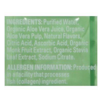 INGREDIENTS: Purified Water, Organic Aloe Vera Juice, Organic Aloe Vera Pulp, Natural Flavors, Citric Acid, Ascorbic Acid, Organic Monk Fruit Extract, Organic Stevia Leaf Extract, Sodium Citrate.