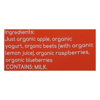 INGREDIENTS: Just Organic Apple, Organic Yogurt, Organic Beets (With Organic Lemon Juice), Organic Raspberries, Organic Blueberries.