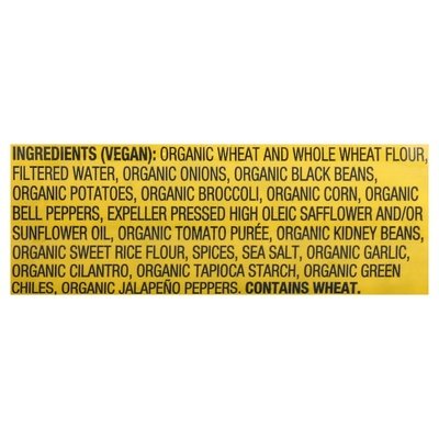 INGREDIENTS: Ingredients (Vegan): Organic Wheat and Whole Wheat Flour, Filtered Water, Organic Onions, Organic Black Beans, Organic Potatoes, Organic Broccoli, Organic Corn, Organic Bell Peppers, Expeller Pressed High Oleic Safflower and/or Sunflower Oil, Organic Tomato Puree, Organic Kidney Beans, Organic Sweet Rice Flour, Spices, Sea Salt, Organic Garlic, Organic Cilantro, Organic Tapioca Starch, Organic Green Chiles, Organic Jalapeno Peppers.