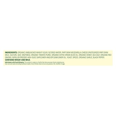 INGREDIENTS: Organic Unbleached Wheat Flour, Filtered Water, Part-Skim Mozzarella Cheese (Pasteurized Part-Skim Milk, Culture, Salt, Enzymes [Without Animal Enzymes or Rennet]), Organic Tomato Puree, Organic Extra Virgin Olive Oil, Organic Honey, Sea Salt, Organic Red Onions, Expeller Pressed High Oleic Safflower and/or Sunflower Oil, Yeast, Spices, Organic Garlic, Black Pepper.
