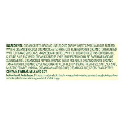 INGREDIENTS:  Organic Pasta (Organic Unbleached Durum Wheat Semolina Flour, Filtered Water), Organic Broccoli, Organic Roasted Potatoes, Filtered Water, Organic Tofu (Filtered Water, Organic Soybeans, Magnesium Chloride), White Cheddar Cheese (Pasteurized Milk, Culture, Salt, Enzymes), Organic Carrots, Expeller Pressed High Oleic Safflower and/or Sunflower Oil, Organic Bell Peppers, Organic Sweet Rice Flour, Organic Onions, Organic Tamari (Water, Organic Soybeans, Organic Alcohol [to Preserve Freshness], Salt), Sea Salt, Mustard Powder, Paprika, Organic Annatto (Color), Organic Garlic, Spices, Black Pepper.