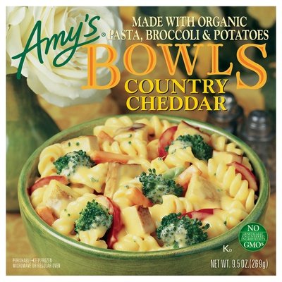 PRODUCT DETAILS: Certified Organic by Quality Assurance International. No GMOs: No genetically engineered ingredients. Microwave or regular oven. From our home to yours. This bowl is a delightful combination of tender organic broccoli, julienne carrots, roasted potatoes, red bell peppers and baked tofu with rotini pasta. To top it off, we mix in a delicious creamy sauce made with aged English Cheddar cheese. Family Owned Since 1987. After the birth of our daughter Amy in 1987, we found there was little time to prepare the quality homemade food we normally ate. Realizing there were others like ourselves, we started Amy's Kitchen to prepare delicious meals for those who care about the food they eat but are often too busy to cook. We use only the finest ingredients and prepare them with the same careful attention in our kitchen as you would in your own home. No meat, fish, shellfish, poultry, eggs or peanuts are ever used in any Amy's products. amys.com. how2recycle.info. We love to cook for you. amys.com. Look for us in the soup aisle! Amy's Lentil Vegetable Organic Soups. Certified 100% recycled paperboard.