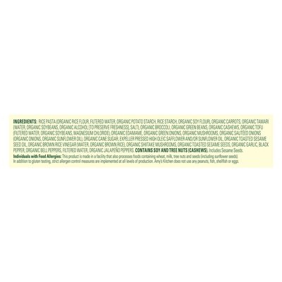 INGREDIENTS:  Rice Pasta (Organic Rice Flour, Filtered Water, Organic Potato Starch, Rice Starch, Organic Soy Flour), Organic Carrots, Organic Tamari (Water, Organic Soybeans, Organic Alcohol [to Preserve Freshness], Salt), Organic Broccoli, Organic Green Beans, Organic Cashews, Organic Tofu (Filtered Water, Organic Soybeans, Magnesium Chloride), Organic Edamame, Organic Green Onions, Organic Mushrooms, Organic Sauteed Onions (Organic Onions, Organic Sunflower Oil), Organic Cane Sugar, Expeller Pressed High Oleic Safflower and/or Sunflower Oil, Organic Toasted Sesame Seed Oil, Organic Brown Rice Vinegar (Water, Organic Brown Rice), Organic Shiitake Mushrooms, Organic Toasted Sesame Seeds, Organic Garlic, Black Pepper, Organic Bell Peppers, Filtered Water, Organic Jalapeno Peppers.