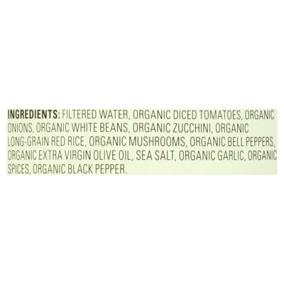 INGREDIENTS: Filtered Water, Organic Diced Tomatoes, Organic Onions, Organic White Beans, Organic Zucchini, Organic Long-Grain Red Rice, Organic Mushrooms, Organic Bell Peppers, Organic Extra Virgin Olive Oil, Sea Salt, Organic Garlic, Organic Spices, Organic Black Peppers.