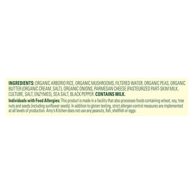 PRODUCT DETAILS: Gluten free. Certified Organic by QAI. Certified Organic: Quality Assurance International. No GMOs: no genetically engineered ingredients. From our home to yours. Amy's Mushroom Risotto captures the essence of this traditional Italian favorite. Tender Arborio rice in a creamy sauce and the rich flavor of mushrooms combined with organic green peas achieve the delicious perfection of a truly fine risotto. Family owned since 1987. After the birth of our daughter Amy in 1987, we found there was little time to prepare the quality homemade food we normally ate. Realizing there were others like ourselves, we started Amy's Kitchen to prepare delicious meals for those who care about the food they eat but are often too busy to cook. We use only the finest ingredients and prepare them with the same careful attention in our kitchen as you would in your own home. No meat, fish, shellfish, poultry, eggs or peanuts are ever used in any Amy's products. how2recycle.info. amys.com. We love to cook for you. Amys.com. Amy's Organic Soups. Look for us in the soup aisle! Certified 100% recycled paperboard.