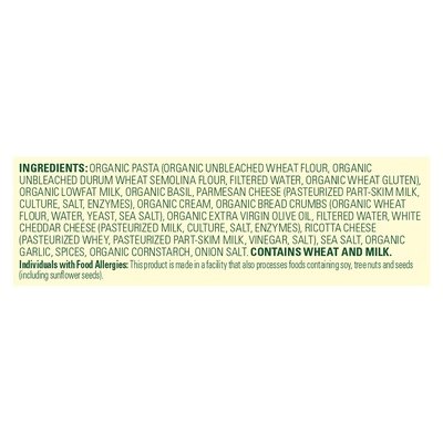 INGREDIENTS: Organic Pasta (Organic Unbleached Wheat Flour, Organic Unbleached Durum Wheat Semolina Flour, Filtered Water, Organic Wheat Gluten), Organic Lowfat Milk, Organic Basil, Parmesan Cheese (Pasteurized Part-Skim Milk, Culture, Salt, Enzymes), Organic Cream, Organic Bread Crumbs (Organic Wheat Flour, Water, Yeast, Sea Salt), Organic Extra Virgin Olive Oil, Filtered Water, White Cheddar Cheese (Pasteurized Milk, Culture, Salt, Enzymes), Ricotta Cheese (Pasteurized Whey, Pasteurized Part-Skim Milk, Vinegar, Salt), Sea Salt, Organic Garlic, Spices, Organic Cornstarch, Onion Salt.