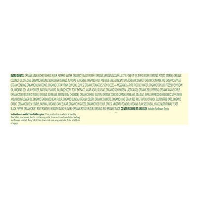 INGREDIENTS: Organic Unbleached Wheat Flour, Filtered Water, Organic Tomato Puree, Organic Vegan Mozzarella-Style Cheese (Filtered Water, Organic Potato Starch, Organic Coconut Oil, Sea Salt, Organic Ground Sunflower Kernels, Natural Flavoring, Organic Fruit and Vegetable Concentrate [Organic Carrot, Organic Pumpkin and Organic Apple]), Organic Onions, Organic Mushrooms, Organic Extra Virgin Olive Oil, Olives, Organic Tomatoes, Soy Cheese - Mozzarella Type (Filtered Water, Organic Expeller Pressed Soybean Oil, Organic Soy Milk Powder, Natural Flavors, Inulin [Chicory Root Extract], Agar Agar, Sea Salt, Organic Soy Protein, Lactic Acid), Organic Bell Peppers, Organic Agave Syrup, Organic Tofu (Filtered Water, Organic Soybeans, Magnesium Chloride), Organic Wheat Gluten, Organic Cooked Cannellini Beans, Sea Salt, Expeller Pressed High Oleic Safflower and/or Sunflower Oil, Organic Garbanzo Bean Flour, Organic Wink Organic Celery, Organic Carrots, Organic Long Grain Red Rice, Tapioca Starch, Gluten Free Oats, Organic Garlic, Organic Green Lentils, Paprika, Organic Cane Sugar, Organic Potatoes, Organic Rice Flour, Spices, Mustard Powder, Organic Flax Seed Meal, Yeast, Nutritional Yeast, Black Pepper, Organic Beet Root Powder, Hickory Smoke Flavor, Organic Potato Flour, Organic Rice Bran Extract.