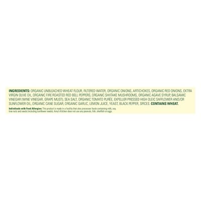 PRODUCT DETAILS: Certified vegan. Vegan.org. Dairy free. Certified Organic: Quality Assurance International. No GMOs: Genetically engineered ingredients. From our home to yours. Looking for a truly special pizza? Look no further. The hand-stretched, tender crust is made from organic flour with extra virgin olive oil and is covered with roasted organic onions, shiitake mushrooms, red bell peppers and with marinated artichoke hearts. It is fully baked, allowing the flavor to soak into the crust for a delicious treat. Try cutting it into appetizer size pieces for your next party and it will remind you of the finest focaccia. Irresistible! Amy's Kitchen does not use any peanuts, fish, shellfish or eggs. Family owned since 1987. After the birth of our daughter Amy in 1987, we found there was little time to prepare the quality homemade food we normally ate. Realizing there were others like ourselves, we started Amy's Kitchen to prepare delicious meals for those who care about the food they eat but are often too busy to cook. We use only the finest ingredients and prepare them with the same careful attention in our kitchen as you would in your own home. No meat, shellfish, poultry, eggs or peanuts are ever used in any Amy's products. vegan.org. amys.com. how2recycle.info. We love to cook for you. amys.com. Look for us in the soup aisle! Organic Soups Chunky Tomato Bisque; Organic Soups Lentil Vegetable. Certified 100% recycled paperboard.