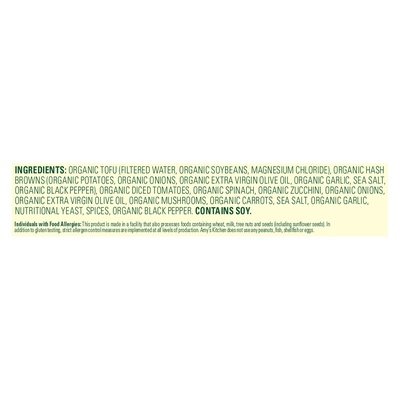 INGREDIENTS: Organic Tofu (Filtered Water, Organic Soybeans, Magnesium Chloride), Organic Hash Browns (Organic Potatoes, Organic Onions, Organic Extra Virgin Olive Oil, Organic Garlic, Sea Salt, Organic Black Pepper), Organic Diced Tomatoes, Organic Spinach, Organic Zucchini, Organic Onions, Organic Extra Virgin Olive Oil, Organic Mushrooms, Organic Carrots, Sea Salt, Organic Garlic, Nutritional Yeast, Spices, Organic Black Pepper.