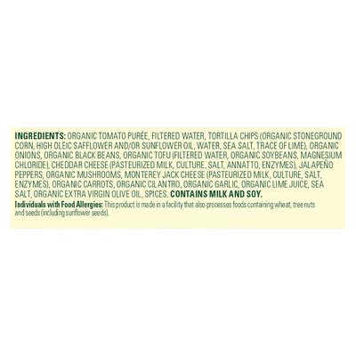 INGREDIENTS: Organic Tomato Puree, Filtered Water, Tortilla Chips (Organic Stoneground Corn, High Oleic Safflower and/or Sunflower Oil, Water, Sea Salt, Trace of Lime), Organic Onions, Organic Black Beans, Organic Tofu (Filtered Water, Organic Soybeans, Magnesium Chloride), Cheddar Cheese (Pasteurized Milk, Culture, Salt, Annatto, Enzymes), Jalapeno Peppers, Organic Mushrooms, Monterey Jack Cheese (Pasteurized Milk, Culture, Salt, Enzymes), Organic Carrots, Organic Cilantro, Organic Garlic, Organic Lime Juice, Sea Salt, Organic Extra Virgin Olive Oil, Spices.