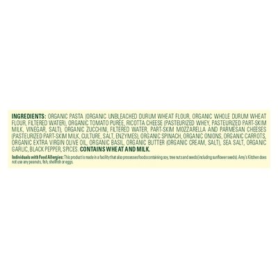INGREDIENTS: Organic Pasta (Organic Unbleached Durum Wheat Flour, Organic Whole Durum Wheat Flour, Filtered Water), Organic Tomato Puree, Ricotta Cheese (Pasteurized Whey, Pasteurized Part-Skim Milk, Vinegar, Salt), Organic Zucchini, Filtered Water, Part-Skim Mozzarella and Parmesan Cheeses (Pasteurized Part-Skim Milk, Culture, Salt, Enzymes), Organic Spinach, Organic Onions, Organic Carrots, Organic Extra Virgin Olive Oil, Organic Basil, Organic Butter (Organic Cream, Salt), Sea Salt, Organic Garlic, Black Pepper, Spices.