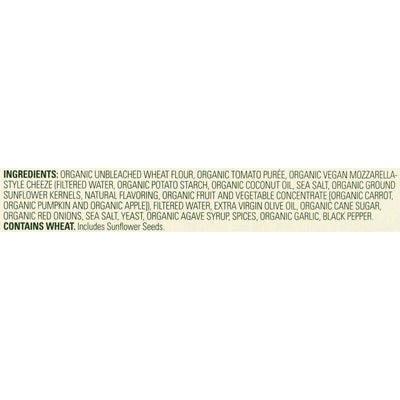 INGREDIENTS: Organic Unbleached Wheat Flour, Organic Tomato Puree, Organic Vegan Mozzarella-Style Cheeze (Filtered Water, Organic Potato Starch, Organic Coconut Oil, Sea Salt, Organic Ground Sunflower Kernels, Natural Flavoring, Organic Fruit and Vegetable Concentrate [Organic Carrot, Organic Pumpkin and Organic Apple]), Filtered Water, Extra Virgin Olive Oil, Organic Cane Sugar, Organic Red Onions, Sea Salt, Yeast, Organic Agave Syrup, Spices, Organic Garlic, Black Pepper.