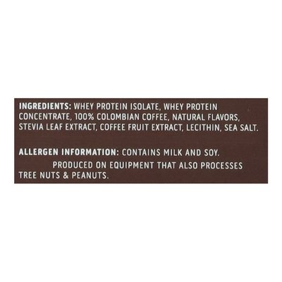 INGREDIENTS: Whey Protein Isolate, Whey Protein Concentrate, 100% Colombian Coffee, Natural Flavors, Stevia Leaf Extract, Coffee Fruit Extract, Lecithin, Sea Salt.