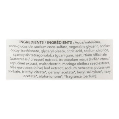 INGREDIENTS: Aqua/Water/Eau, Coco-Glucoside, Sodium Coco-Sulfate, Vegetable Glycerin, Sodium Cocoyl Isethionate, Glyceryl Oleate, Citric Acid, Sodium Chloride, Cyamopsis Tetragonoloba (Guar) Gum, Nasturtium Officinale (Watercress/Cresson) Extract, Tropaeolum Majus (Indian Cress/Capucine) Extract, Maltodextrin, Moringa Oleifera Seed Extract, Olea Europaea (Olive) Leaf Extract, Sodium Benzoate, Potassium Sorbate, Triethyl Citrate (Fragrance (Parfum), Geranyl Acetate (Fragrance (Parfum), Hexyl Salicylate (Fragrance (Parfum), Hexyl Acetate (Fragrance (Parfum), Alpha-Ionone (Fragrance (Parfum).