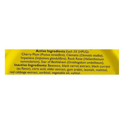 INGREDIENTS: Active Ingredients: Each 5x (HPUS): Cherry Plum (Prunus Cerasifera), Clematis (Clematis Vitalba), Impatiens (Impatients Glandulifera), Rock Rose (Helianthemumnummularium), Star of Bethlehem (Ornithogalum Umbellatum). Inactive Ingredients: Beeswax, Black Carrot Extract, Black Currant (as Flavor), Citric Acid, Elder Extract, Gum Arabic, Isomalt, Maltitol, Red Cabbage Extract, Sorbitol, Vegetable Oil, Xylitol.
