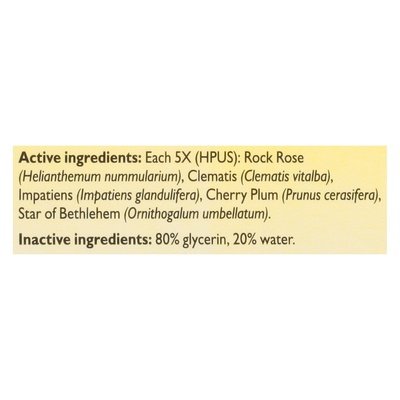 INGREDIENTS: Active Ingredients: Each 5x (HPUS): Rock Rose (Helianthemum Nummularium), Clematis (Clematis Vitalba), Impatiens (Impatiens Glandulifera), Cherry Plum (Prunus Cerasifera), Star of Bethlehem (Ornithogalum Umbellatum). Inactive Ingredients: 80% Glycerin, 20% Water.