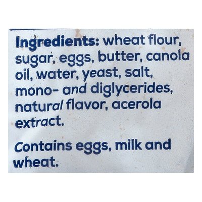INGREDIENTS: Wheat Flour, Sugar, Eggs, Butter, Canola Oil, Water, Yeast, Salt, Mono- and Diglycerides, Natural Flavor, Acerola Extract.