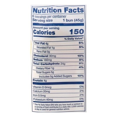PRODUCT DETAILS: Free from artificial flavors. Per Bun: 5 g sugars; 150 cal. No GMO ingredients. The brioche hot dog buns. Free of high fructose corn syrup. Free of bleached flour. Brioche is the hallmark of France - a bread made with wheat, floor, eggs, butter, and milk for an incomparable texture and taste! Our ingredients promise! No artificial flavors. No GMO ingredients. No high fructose corn syrup. Check out our complete ingredient no-no list at www.bakerly.com/no-no-list. Our delicious brioche! We have elevated the bun game, originally made for hot dogs, these buns are so buttery and soft you will want to stuff them with countless options, from gourmet sausages to grilled meats, and even lobster! these brioche buns are so good, you may even love them straight from the bag. Bon appetit! www.bakerly.com. Authentic French recipe proudly made in USA.