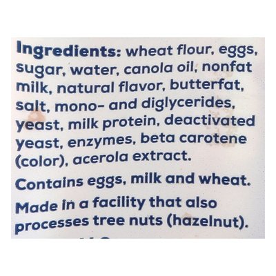 INGREDIENTS: Wheat Flour, Eggs, Sugar, Water, Canola Oil, Nonfat Milk, Natural Flavor, Butterfat, Salt, Mono- and Diglycerides, Yeast Milk Protein, Deactivated Yeast, Enzymes, Beta Carotene (Color), Acerola Extract.