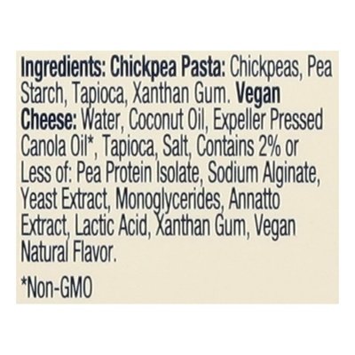 INGREDIENTS: Chickpea Pasta: Chickpeas, Pea Starch, Tapioca, Xanthan Gum, Vegan Cheese: Waler, Coconut Oil, Expeller Pressed Canola Oil (Non-GMO), Tapioca, Salt, Contains 2% or Less of: Pea Protein Isolate, Sodium Alginate, Yeast Extract, Monoglycerides, Annatto Extract, Lactic Acid, Xanthan Gum, Vegan Natural Flavor.