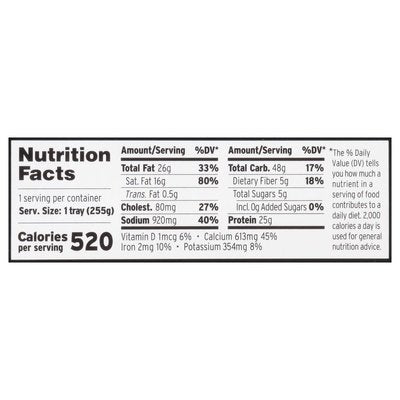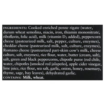 INGREDIENTS: Cooked Enriched Penne Rigate (Water, Durum Wheat Semolina, Niacin, Iron, Thiamin Mononitrate, Riboflavin, Folic Acid), Milk (Vitamin D3 Added), Peppercorn Cheese (Pasteurized Milk, Salt, Pepper, Culture, Enzymes), Cheddar Cheese (Pasteurized Milk, Salt, Culture, Enzymes), Romano Cheese (Pasteurized Part-Skim Cow's Milk, Cheese Culture, Salt, Enzymes), Rice Flour, Water, Butter (Cream, Salt), Salt, Green and Black Peppercorns, Chipotle Puree (Red Chile, Water, Chipotles [Smoked Red Jalapeno], Apple Cider Vinegar, Lime Juice, Rice Flour, Sea Salt, Garlic, Onion, Honey, Rosemary, Thyme, Sage, Bay Leaves), Dehydrated Garlic.
