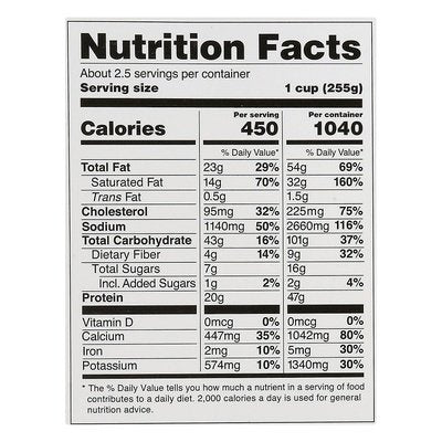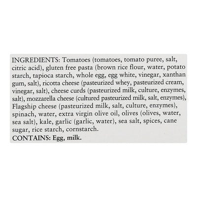 INGREDIENTS: Tomatoes (Tomatoes, Tomato Puree, Salt, Citric Acid), Gluten Free Pasta (Brown Rice Flour, Water, Potato Starch, Tapioca Starch, Whole Egg, Egg White, Vinegar, Xanthan Gum, Salt), Ricotta Cheese (Pasteurized Whey, Pasteurized Cream, Vinegar, Salt), Cheese Curds (Pasteurized Milk, Culture, Enzymes, Salt), Mozzarella Cheese (Cultured Pasteurized Milk, Salt, Enzymes), Flagship Cheese (Pasteurized Milk, Salt, Culture, Enzymes), Spinach, Water, Extra Virgin Olive Oil, Olives (Olives, Water, Sea Salt), Kale, Garlic (Garlic, Water), Sea Salt, Spices, Cane Sugar, Rice Starch, Cornstarch.