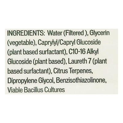 INGREDIENTS: Water (Filtered), Glycerin (Vegetable), Caprylyl/Capryl Glucoside (Plant Based Surfactant), C10-16 Alkyl Glucoside (Plant Based), Laureth 7 (Plant Based Surfactant), Citrus Terpenes, Dipropylene Glycol, Benzisothiazolinone, Viable Bacillus Cultures.