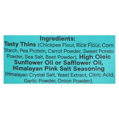 INGREDIENTS: Tasty Thins (Chickpea Flour, Rice Flour, Corn Starch, Pea Protein, Carrot Powder, Sweet Potato Powder, Beet Powder), High Oleic Sunflower Oil or Safflower Oil, Sea Salt.