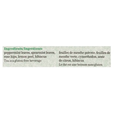 DESCRIPTION: Tea bags individually wrapped in foil pouches. Tea is a gluten-free beverage. Caffeine free. Family tea blenders since 1945. Blend of cool garden spearmint & peppermint. All natural. Unlock the Freshness: Here's the Key: We use a special foil pouch to protect your tea from any air, moisture and surrounding aromas. So open and enjoy the unparalleled. Flavour. Freshness. Aroma of Bigelow tea everywhere you go! Our First Home: Where Bigelow Tea Was Born Sometime in 1942 or '43, my mom and dad decided they wanted to start a tea business. They felt strongly that, for the company to be a success, they needed a home where they could begin. Searching the local streets, they found a brownstone, which was in terrible disrepair. Optimistic, they bought it with the last of their life savings, and repaired it themselves. It was in this home in 1945, where my mom and dad opened the doors to the new Bigelow Tea Company. Little could they have imagined that their dream would one day grow to be America's no. 1 Specialty Tea company! - David Bigelow. Our Promise: We're fully committed to your satisfaction and we love to hear from you! When you do call, please share the code number on this box with the Consumer Service crew. bigelowtea.com. Our boxes, tea bags, strings and tags are 100% biodegradable. We love recycle. Blended and packaged in USA. Manufactured in the USA. < Peppermint Leaves, Spearmint Leaves, Rose Hips, Lemon Peel, Hibiscus.