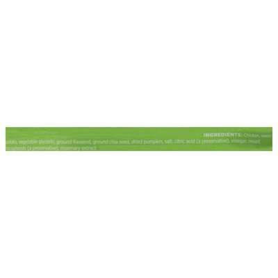 INGREDIENTS: Chicken Sweet Potato, Vegetable Glycerin, Ground Flaxseed, Ground Chia Seed, Dried Pumpkin, Salt, Citric Acid (a Preservative), Vinegar, Mixed Tocopherols (a Preservative), Rosemary Extract.