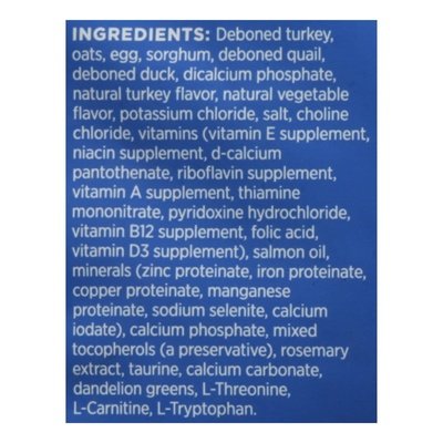 INGREDIENTS: Deboned Turkey, Oats, Egg, Sorghum, Deboned Quail, Deboned Duck, Dicalcium Phosphate, Natural Turkey Flavor, Natural Vegetable Flavor, Potassium Chloride, Salt, Choline Chloride, Vitamins (Vitamin E Supplement, Niacin Supplement, D-Calcium Pantothenate, Riboflavin Supplement, Vitamin A Supplement, Thiamine Mononitrate, Pyridoxine Hydrochloride, Vitamin B12 Supplement, Folic Acid, Vitamin D3 Supplement), Salmon Oil, Minerals (Zinc Proteinate, Iron Proteinate, Copper Proteinate, Manganese Proteinate, Sodium Selenite, Calcium Iodate), Calcium Phosphate, Mixed Tocopherols (a Preservative), Rosemary Extract, Taurine, Calcium Carbonate, Dandelion Greens, L-Threonine, L-Carnitine, L-Tryptophan.