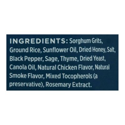 INGREDIENTS: Sorghum Grits, Ground Rice, Sunflower Oil, Dried Honey, Salt, Black Pepper, Sage, Thyme, Dried Yeast, Canola Oil, Natural Chicken Flavor, Natural Smoke Flavor, Mixed Tocopherols (a Preservative), Rosemary Extract.