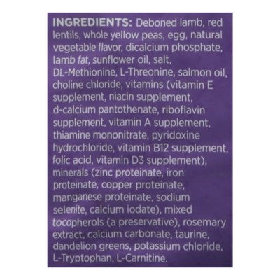 INGREDIENTS: Deboned Lamb, Red Lentils, Whole Yellow Peas, Egg, Natural Vegetable Flavor, Dicalcium Phosphate, Lamb Fat, Sunflower Oil, Salt, DL-Methionine, L-Threonine, Salmon Oil, Choline Chloride, Vitamins (Vitamin E Supplement, Niacin Supplement, D-Calcium Pantothenate, Riboflavin Supplement, Vitamin A Supplement, Thiamine Mononitrate, Pyridoxine Hydrochloride, Vitamin B12 Supplement, Folic Acid, Vitamin D3 Supplement), Minerals (Zinc Proteinate, Iron Proteinate, Copper Proteinate, Manganese Proteinate, Sodium Selenite, Calcium Iodate), Mixed Tocopherols (a Preservative), Rosemary Extract, Calcium Carbonate, Taurine, Dandelion Greens, Potassium Chloride, L-Tryptophan, L-Carnitine.