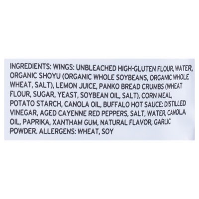 INGREDIENTS: Wings: Unbleached High-Gluten Flour, Water, Organic Shoyu (Organic Whole Soybeans, Organic Whole Wheat, Salt), Lemon Juice, Panko Bread Crumbs (Wheat Flour, Sugar, Yeast, Soybean Oil, Salt), Corn Meal, Potato Starch, Canola Oil. Buffalo Hot Sauce : Distilled Vinegar, Aged Cayenne Red Peppers, Salt, Water, Canola Oil, Paprika, Xantham Gum, Natural Flavor, Garlic Powder.