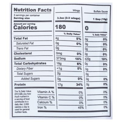 PRODUCT DETAILS: Made from Plants: High protein 17 g per serving. 180 calories per serving. Cholesterol free. Non-GMO. Hand-battered. Spicy & tangy. Blackbird wings are crafted from seitan, our clean label plant-based meat. They're hand-battered in NYC for the perfect crispy outside and tender inside. Founded by chefs, we're on a mission to make restaurant quality foods available to you at home. Always 100% made from plants. Naturally boneless. Instagram. Facebook. TikTok. (at)Blackbird_Foods. Questions or Comments? Email us at Info(at)blackbirdfoods.com.