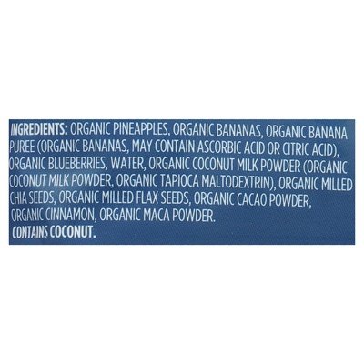 INGREDIENTS: Organic Pineapples, Organic Bananas, Organic Banana Puree (Organic Bananas, Ascorbic Acid), Organic Blueberries, Organic Coconut Milk Powder, Organic Milled Chia Seeds, Organic Cacao Powder, Organic Milled Flax Seeds, Organic Maca Powder, Organic Cinnamon.